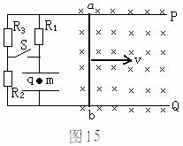 如图15所示,光滑的平行导轨P、Q相距l=1m,处在同一水平面中,导轨左端接有如图所示的电路,其中水平放置的平行板电容器C两极板间距离d =10mm,定值电阻R1=R3=8Ω,R2=2Ω,导轨电阻不计,磁感应强度B=0.4T的匀强磁场竖直向下穿过导轨平面,当金属棒ab沿导轨向右匀速运动(开关S断开,金属棒电阻也不计)时,电容器两极板之间质量m=1×10-14kg,带电荷量q = -1×10-15C的粒子恰好静止不动;当S闭合时,粒子以加速度a=7m/s2向下做匀加速运动,取g=10m/s2,求: