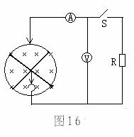在磁感应强度为B=0.4 T的匀强磁场中放一个半径r0=50 cm的圆形导轨,上面搁有互相垂直的两根导体棒,一起以角速度ω=103 rad/s逆时针匀速转动。圆导轨边缘和两棒中央通过电刷与外电路连接,若每根导体棒的有效电阻为R0=0.8 Ω,外接电阻R=3.9 Ω,如图16所示,求: