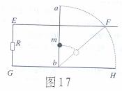 如图17所示,平行的光滑金属导轨EF和GH相距L,处于同一竖直平面内,GE间解有阻值为R的电阻,轻质金属杆ab长为2L,近贴导轨数值放置,离b端0.5L处固定有质量为m的小球,整个装置处于磁感应强度为B并与导轨平面垂直的匀强磁场中,当ab杆由静止开始紧贴导轨绕b端向右倒下至水平位置时,球的速度为v,若导轨足够长,导轨及金属杆电阻不计,求在此过程中:
