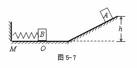 例4(2006年天津)如图5-7所示,坡道顶端距水平面高度为h,质量为m1的小物块A从坡道顶端由静止滑下,进入水平面上的滑道时无机械能损失,为使A制动,将轻弹簧的一端固定在水平滑道延长线M处的墙上,另一端与质量为m2的档板相连,弹簧处于原长时,B恰好位于滑道的末端O点。A与B碰撞时间极短,碰撞后结合在一起共同压缩弹簧。已知在OM段A、B与水平面间的动摩擦因数为μ,其余各处的摩擦不计,重力加速度为g,求