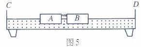 如图5所示气垫是常用的一种实验仪器,它是利用气泵使带孔的导轨与滑块之间形成气垫,使滑块悬浮在轨道上,滑块在轨道上的运动可视为没有摩擦。我们可以用带竖直挡板C和D的气垫轨道以及滑块A和B来验证动量守恒定律,实验装置如图所示(弹簧的长度忽略不计),采用的实验步骤如下: