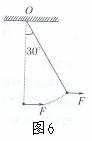 如图6所示,长度为L=1m的细绳一端固定于O点,另一端竖直悬吊一个50kg的小球,若用水平恒力F=500N拉小球,当悬绳拉到竖直方向成300角时,撤去拉力F。(g=10
