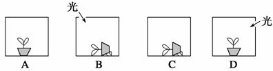 5.(08上海综合)某学生在实验室中将培养在全营养培养基上的蚕豆幼苗分别放入4个暗箱中,B和D两个暗箱分别在顶部和右侧开孔,使光线射入,如下图所示。一周后,下列蚕豆幼苗最不可能发生弯曲的是 ( )