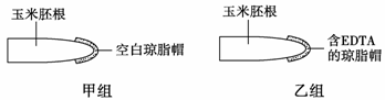 实验一:将空白琼脂和含EDTA的琼脂做成帽状,分别套在甲、乙两组玉米胚根的根冠外(示意图如下)。