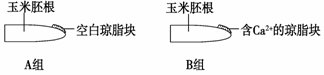 第三步:在A组的胚根上方放一个空白琼脂块,在B组的胚根上方放一个含Ca2+的琼脂块(如图)