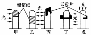 如图所示,甲、乙分别用不透光的锡箔纸套在燕麦胚芽鞘的不同部位,丙、丁、戊则分别用不透水的云母片插入燕麦胚芽鞘的不同部位,从不同方向照光,培养一段时间后,胚芽鞘的生长情况是