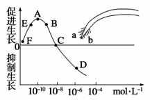 C.a侧的生长素浓度为最适宜浓度,细胞伸长生长快,b侧的生长素浓度低于a侧,相当于曲线FE段浓度,因而细胞伸长生长慢