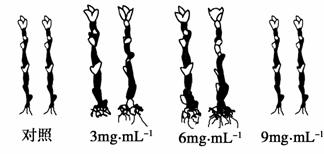 14.在探究生长素类似物促进插条生根的最适浓度时,一名技术员用几种不同浓度的α-萘乙酸(一种人工合成的生长素类似物)溶液处理插条基部,然后在沙床中培养,观察生根情况。图1为不同浓度的生长素溶液对根的促进作用的示意图,图2为α-萘乙酸促进枝条生根的情况。请据图1和图2判断,在下列各项浓度值中,最好选用 ( )