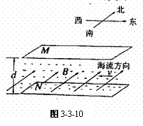 由于受地球信风带和盛西风带的影响,在海洋中形成一种河流称为海流.海流中蕴藏着巨大的动力资源.据统计,世界大洋中所有海洋的发电能力达109Kw.早在19世纪法拉第就曾设想,利用磁场使海流发电,因为海水中含有大量的带电离子,这些离子随海流作定向运动,如果有足够强的磁场能使这些带电离子向相反方向偏转,便有可能发出电来.目前,日本的一些科学家将计划利用海流建造一座容量为1500kW的磁流体发电机.如图3-3-10所示为一磁流体发电机的原理示意图,上、下两块金属板M、N水平放