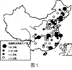 读“中国造纸工业分布示意图”(图5)。回答16-17题。