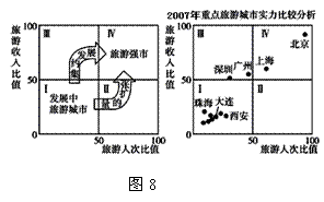23.2007年“五一黄金周”期间,我国旅游市场异常火爆。读“中国重点城市旅游实力比较图”,有关图8中各城市的叙述,正确的是( )