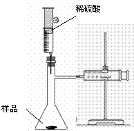 (2)另称取相同质量的样品放入瓶中,实验装置如右图所示。推动针筒逐滴加入稀硫酸,至没有气泡产生为止,共消耗10mL稀硫酸。为了保证实验成功,所选用的用于测量气体体积的针筒的最大刻度值应大于或等于_____ ___(mL)(设实验在标准状况下进行)。实验中针筒中收集到的气体折算成标准状况下的体积为VmL(针筒活塞的内壁的摩擦力忽略不计)。该科研小组设称取的每份样品中的Na2CO3、NaHCO3的物质的量分别为x、y,且没有利用化学方程式进行计算,就列出了如下算式:x+y=(V-10)/22400,他们依据的原理是____ _____。根据相似原理,请完成下列算式: