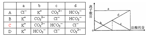 14、(八校)向一定量的K2CO3溶液中缓慢滴加稀盐酸,并不断搅拌。随着盐酸的加入,溶液中离子数目也相应地发生变化。如图所示,四条曲线与溶液中的离子的对应关系,完全正确的是( )