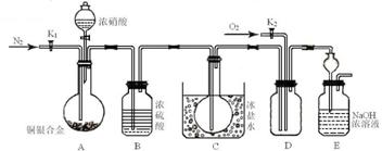 27(闸北二)、某研究性实验小组欲验证浓硝酸在与Cu、Ag合金的反应过程中除生成NO2气体外,还会有少量NO生成、并测定Cu、Ag合金中Cu的质量分数。查阅相关资料表明:“常温下,NO2与N2O4混合存在,在低于0℃时几乎只有无色的N2O4液体或晶体存在。”为此,他们设计了如下图所示的装置。