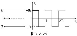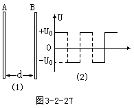 19.如图3-2-27(1)中,A和B表示在真空中相距为d的两平行金属板,加上电压后,它们之间的电场可视为匀强电场,图(2)表示一周期性的交变电压的波形,横坐标代表时间t,纵坐标代表电压U,从t=0开始,电压为一给定值U0,经过半周期,突然变为-U0;再过半个周期,又突然变为U0……如此周期性地交替变化.