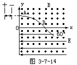 3.如图3-7-14所示,在y轴右方有一匀强磁场,磁感应强度为B,方向垂直于纸面向外;在x轴下方,有一匀强电场,场强为E,方向平行x轴向左,有一铅板放置在y轴处,且与纸面垂直,现有一质量为m,带电量q的粒子由静止经过加速电压U的电场加速,然后,以垂直于铅板的方向从A处直线穿过铅板,而后从x轴上的D处以与x轴正向夹角为60°的方向进入电场和磁场叠加的区域,最后达到y轴上的C点,已