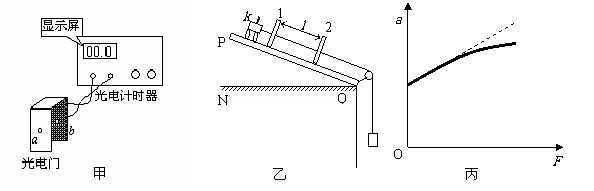 14.像打点计时器一样,光电计时器也是一种研究物体运动情况的常见计时仪器,其结构如图甲如示a、b分别是光电门的激光发射和接收装置。当有物体从a、b间通过时,光电计时器就可以显示物体的挡光时间。现利用图乙所示装置设计一个“探究物体运动的加速度与合外力、质量关系的实验,图中NQ是水平桌面、PQ是一端带有滑轮的长木板,1、2是固定在木板上的两个光电门(与之连接的两上光电计时器没有画出).小车上固定着用于挡光的窄片K,让小车从木板的顶端滑下,光电门各自连接的计时器显示窄片K的挡光时间分别为t1和t2.