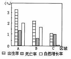 答案:D点拨:B区域人口出生率高,死亡率低,自然增长率高,主要原因是医疗卫生条件不断进步,死亡率下降,但出生率很高,反映了生产力水平比较低,人们仍然用增加人口手段来促进社会经济发展。
