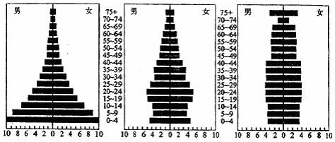 答案:A 点拨:非洲国家人口出生率高,年轻人口最多,人口年龄结构表现为典型金字塔形状,中国由于上世纪70年代开始采取计划生育的人口政策,出生率、死亡率都下降,处于增长率下降的过渡型阶段,低年龄段人口减少,中青年人口多,法国为三低型增长模式,老龄化严重。