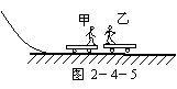 如图2-4-5所示,甲、乙两人各乘一辆冰车在山坡前的水平冰道上游戏,甲和他冰车的总质量m1=40kg,从山坡上自由下滑到水平直冰道上的速度v1=3m/s,乙和他的冰车的质量m2=60kg,以大小为v2=0.5m/s的速度迎面滑来.若不计一切摩擦,为使两车不再相撞,试求甲的推力对乙做功的数值范围?