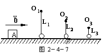 如图2-4-7所示,滑块A的质量m=0.01kg,与水平地面间的动摩擦因素μ=0.2,用细线悬挂的小球质量均为m=0.01kg,沿x轴排列,A与第1只小球及相邻两小球间距离均为s=2m,线长分别为L1、L2、L3……(图中只画出三只小球,且小球可视为质点),开始时,滑块以速度v0=10m/s沿x轴正方向运动,设滑块与小球碰撞时不损失机械能,碰撞后小球均恰能在竖直平面内完成完整的圆周运动,重力加速度g=10m/s2。试求:(1)滑块能与几个小球碰撞?(2)碰撞中第n个小球悬线长Ln的表达式?