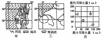 ⑴丙图中的点,能正确反映甲、乙两地区降水特征的依次是 和 。填表比较两地区河流水文特征及成因。