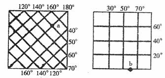 答案:C点拨:b的地理坐标是(纬度0度,东经60度),a的地理纬度是(南纬50度,经度180度)。故b在a的西北方向。