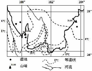 答案:C点拨:通过经纬度和河流,判断该地区为云贵高原,4℃等温线向北突出地区有长江一条支流经过,属于河流谷地,地势低,温度高于同纬度的两侧地区,等温线向高纬度方向弯曲。