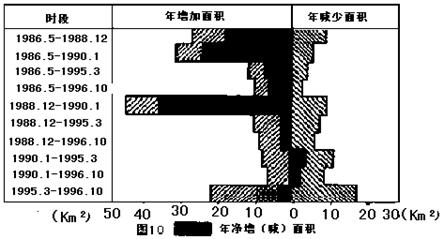(09泰州市联考)下图是1986 -1996年黄河三角洲陆地面积增减的变化情况,读图回答10-11题。