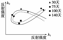 (08江苏无锡)判读卫星遥感图像时常使用对比分析法,具体说就是对不同时间、不同地面物体的卫星图像进行对比和分析。如图,虚实两线分别代表玉米和大豆两种农作物在不同时间对两种不同电磁波的反射强度(图中符号分别代表播种30、75、100、140天后两种农作物反射的电磁波强度)。读图完成4-6题。