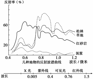 2007山东临沂一种物质所产生的自身辐射或对外来辐射所产生的反射和透射,形成了该物质的一种特殊标志--波谱特征。下图显示了松林、草地、红砂岩和泥浆的反射波谱曲线,读图回答12-14题。