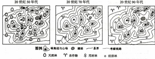 29.图12是“我国某湿润山区不同年代植被状况图”。20世纪50年代一支考察队从S点出发沿线考察该山区的自然资源,最终到达最高峰,考察日志中记录到:“河谷地带都发育有河流,山区植被茂密”。据此回答下列问题。(16分)