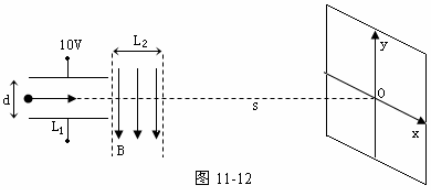 16.如图11-12所示,由电容器和磁场组成一射线管,电容器极板长