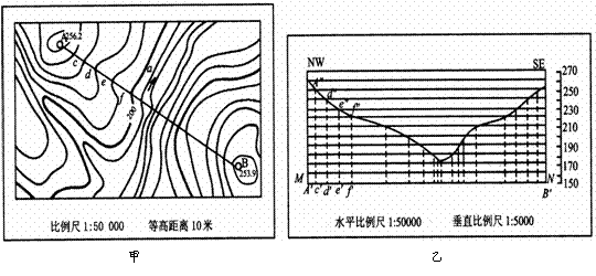 ②选择适当的水平比例尺将等高线图上的剖面线转绘到剖面图中作横轴,一般地说剖面图的水平比例尺与等高线图的比例尺相同,如图中乙图中的A′B′线;用等高线图的高度确定合理的垂直比例尺作纵轴,一般地说垂直比例尺比水平比例尺大若干倍,如图中的垂直比例尺是水平比例尺的10倍。