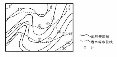 [经典例题3]潜水等水位线图就是潜水面等高线图。它是根据潜水面上各点的水位标高绘制成的;一般绘在等高线地形图上。绘制的方法与绘制地形等高线的方法类似。读潜水等水位线图: