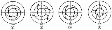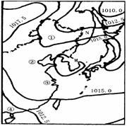 解析:。第(1)题:因为相邻两条等值线的数值可能相同,也可能相差一定数值。图中M点与其南部(1015. 0))、北部(1015.0)的等压线相对比,可知其值可能为:1012.5、1015.0、1017.5。M点所在等压线与其西部相邻的另一等压线(1017.5)相比较,其数值可能为:1015.0、1017.5、1020.0。以上两条分析的数值交集即为M点可能的数值。第(2)题:N处位于低压中心(气旋)的南侧,气压梯度力应该由南向北,在北半球右偏,应该是偏南风或西风,但不会出现偏北风。第(3)题:我国东部降水的主要类型是锋面雨,锋面的移动规律性较强,4月份夏季风刚刚生成,徘徊在南部沿海一带,在我国的南岭以南开始出现雨带。答案:(1)C (2)D (3)D