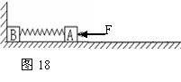 7.(湖南省长沙市一中高三第二次月考卷.物理.14)如图18所示,光滑水平面上,轻弹簧两端分别拴住质量均为m的小物块A和B,B物块靠着竖直墙壁。今用水平外力缓慢推A,使A、B间弹簧压缩,当压缩到弹簧的弹性势能为E时撤去此水平外力,让A和B在水平面上运动.求:(1)当B离开墙壁时,A物块的速度大小;(2)当弹簧达到最大长度时A、B的速度大小;(3)当B离开墙壁以后的运动过程中,弹簧弹性势能的最大值.
