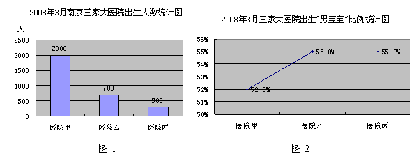 22.今年不仅是民间所谓的“金鼠年”,又恰逢2008年奥运会,不少准妈妈想借机生个“奥运宝宝”.据不完全统计,今年3月份在南京三家大医院出生的宝宝总数如图1所示,其中每家医院出生的男宝宝的百分比如图2所示.
