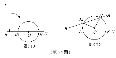(2)若射线BA绕点B按顺时针方向旋转与⊙O相交于M、N两点(如图(2)),MN=