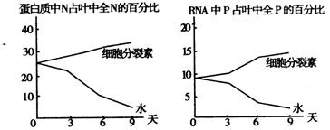 30.细胞衰老时,细胞内蛋白质和RNA的总量均会下降。将一完整的烟草叶片,一半用细胞分裂素处理,另一半用水处理,放置暗处一段时间后,测得叶片中蛋白质和RNA的含量如图所示。由实验结果不能推出的结论是