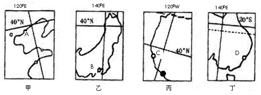 下面分别为A、B、C三个城市示意图,据图回答1-3题。