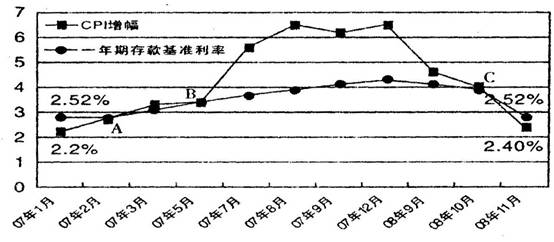 下图是我国某两年中的消费者物价指数(CPI)和金融机构存款基准利率变化示意图,A、B、C三点是两条曲线的交点。根据下图所反映的储蓄存款收益变化状况,居民选择减少银行存款意愿较为强烈的时段是