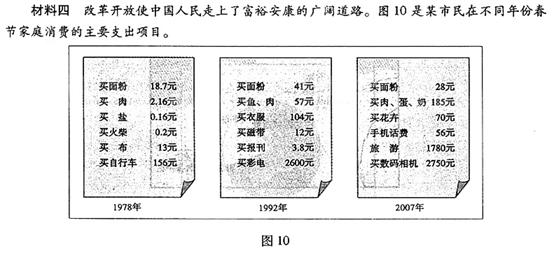 26、材料:改革开放使中国人民走上了富裕安康的广阔道路。图10是某市民在不同年份春节家庭消费的主要支出项目。春节消费体现了不同年代生活消费的主要特征。