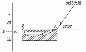 下图为某一河流及河床AB处的剖面示意图。某地理兴趣小组成员9月23日正午(地方时)在A处观测到的太阳仰角为55°30′,且太阳光线与河岸接近垂直,据此回答24-25题。