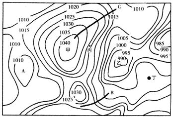 C.丙城市吹偏南风 D.丙城市比丁城市气温日较差小