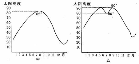 29.下图为甲乙两地一年中正午太阳高度变化曲线示意图,读图回答:(12分)