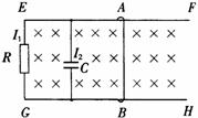 图中EF、GH为平行的金属导轨,其电阻可不计,R为电阻器,C为电容器,AB为可在EF和GH上滑动的导体横杆。有均匀磁场垂直于导轨平面。若用I1和I2分别表示图中该处导线中的电流,则当横杆AB[ ]![]()