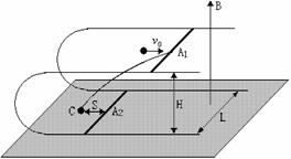 光滑金属导轨,在导轨面上各放一根完全相同的质量为m的匀质金属杆A1和A2,开始时两根金属杆位于同一竖直平面内且杆与轨道垂直。设两导轨面相距为H,导轨宽为L,导轨足够长且电阻不计,金属杆单位长度的电阻为r。现有一质量为m/2的不带电小球以水平向右的速度v0撞击杆A1的中点,撞击后小球反弹落到下层面上的C点。C点与杆A2初始位置相距为S。求: