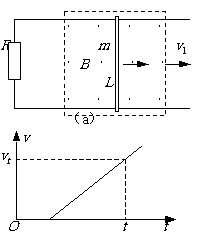 (上海卷)如图(a)所示,光滑的平行长直金属导轨置于水平面内,间距为L、导轨左端接有阻值为R的电阻,质量为m的导体棒垂直跨接在导轨上。导轨和导体棒的电阻均不计,且接触良好。在导轨平面上有一矩形区域内存在着竖直向下的匀强磁场,磁感应强度大小为B。开始时,导体棒静止于磁场区域的右端,当磁场以速度v1匀速向右移动时,导体棒随之开始运动,同时受到水平向左、大小为f的恒定阻力,并很快达到恒定速度,此时导体棒仍处于磁场区域内。