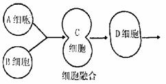 (1)若A细胞为骨髓瘤细胞,B细胞为已免疫的B淋巴细胞,那么D细胞称为 细胞,融合的细胞有 种。从中筛选出它的方法是在 中培养。筛选出的细胞既能无限增殖,又能产生 。其产物连接治癌药物可制成 作用于癌细胞。